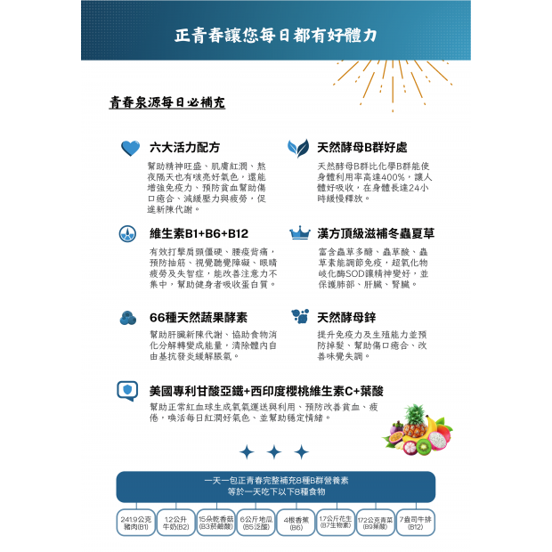 結合 6 種超級蔬果 + 8 種B群維生素,全面補給青春所需能量!