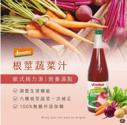 來自德國百年果汁品牌 Voelkel,自1936年傳承至今,堅持自然生態永續理念,採用「瞬間低溫殺菌法」保留蔬菜最完整的營養與活性。榮獲德國Demeter與歐盟有機雙認證,嚴選有機胡蘿蔔、甜菜根等根莖類蔬菜榨取,無濃縮、無加糖、無人工添加,純粹呈現大地的能量與滋養。